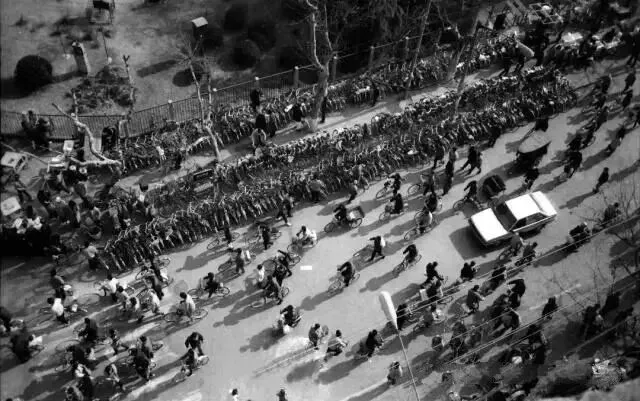 1987年,盐城主干道,一溜烟的二八杠自行车,非常拉风,那个时候的小轿车非常稀有。照片来源:俞文鸿。