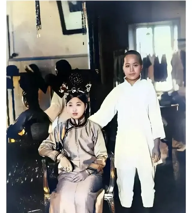 图中坐着的披缎面的是富家千金,身后站着的是通房丫头,屋里镜子后头还能照出人影,一屋子的器物都发亮,袖口里垫的棉层鼓鼓囊囊,丫头的白褂子一尘不染,可站姿像钉住了,妈看见这张就嘀咕,穷人家的女娃在灶台边忙得脚不沾地,哪有功夫垫枕拍照。
