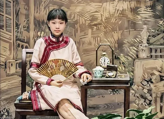这个场景是照相馆的景,木底座闹钟咔哒咔哒走,茶碗口小盖儿扣得严,姑娘手里把折扇撑开,这类正装照是少有的讲究,照片看着体面,外头风一刮,绣边就贴腿,师傅喊别眨眼,三数完再放松,镜头一合上,表情也就垮下来了。