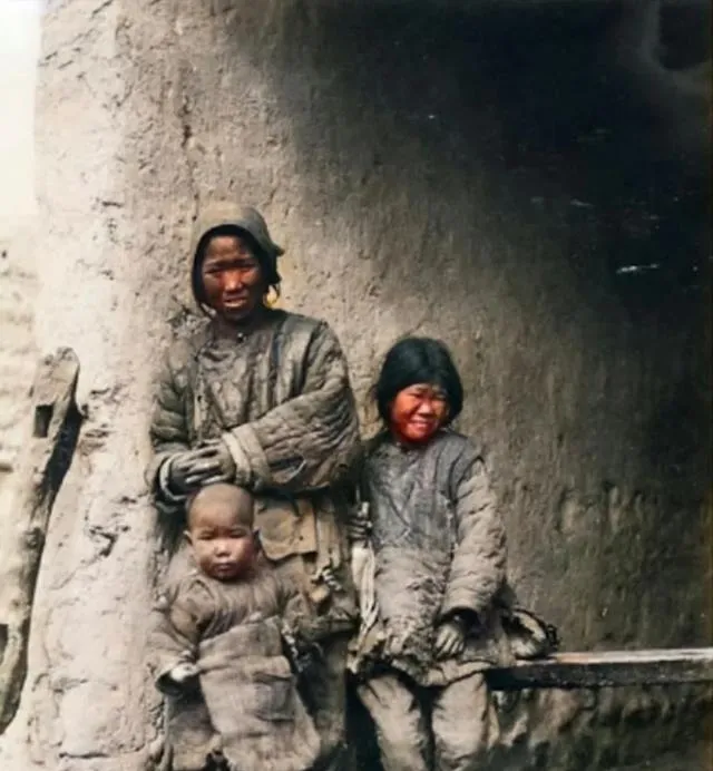 土墙根下这娘仨,外衣补到没地方补了,袖口里塞着麦秆当棉絮,孩子脸颊风裂开口,手心里全是泥浆,这才是一百年前的日常,冬天火盆没炭就烧秸秆,烟呛得眼泪直掉,晚上把鞋脱了放灶边,第二天还是凉得脚抽筋,现在屋里一开空调暖风呼呼吹,以前天亮了被窝还是凉的。