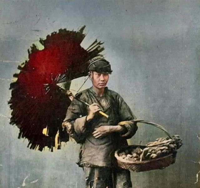 这个人手里挑的是小食担子,背后那把伞烂得见骨,伞骨露在外头像刺,伞面一半是火红一半是灰,他用牙咬着旱烟袋嘴,闲不住就敲一下担杠喊两声,雨来了就挤在檐下,伞只能遮个意思,顾客翻一把零钱,买一把烤红薯,热气往脸上一扑,手就暖了。
