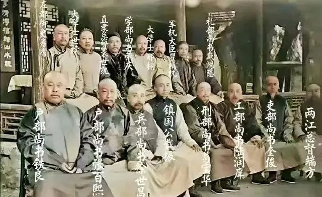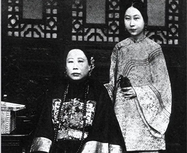 这张老黑白里,前头坐着的补服厚重,胸前补方一块块,侧后站着的女子收着手,没有笑,屋里格窗花纹繁琐,桌上案卷压着,像办事的地儿,家里人看了说,这姿势像审人,谁也不敢喘大气,镜头按下时连咳嗽都憋回去。
