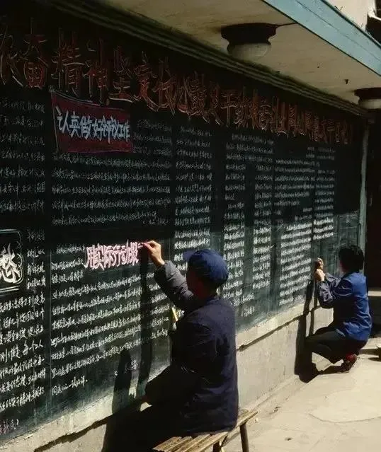 图里的长墙就是黑板报,粉笔装在铁皮盒里,手指头被粉一蹭就白了,字一排又一排挤得满满当当,粗的标题刷着红边儿,细字用的是硬粉笔,写的人蹲着站着都得使着腰,板下头一条长凳子专门给人趴着描边,小时候路过总想摸一把,手上一抹就白,回家挨我妈一句“别蹭衣裳”,那会儿街口的消息都在这墙上跑,现在手机一滑就知道天南地北的事了。