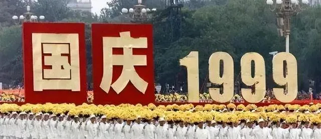 图里这面巨大的字牌就叫庆典花车阵中的主题牌面,红底金字,规矩正气,方方正正立在花海里,队伍一压过来,黄花顶在前排一片晃,电视里解说拉长了声儿,我们在屋里跟着屏幕喊,爸说抬头看,礼花上去那一下可不小,楼下小孩吓得往奶奶怀里一扎,笑也来了,九九年的国庆,真叫一个阔气。