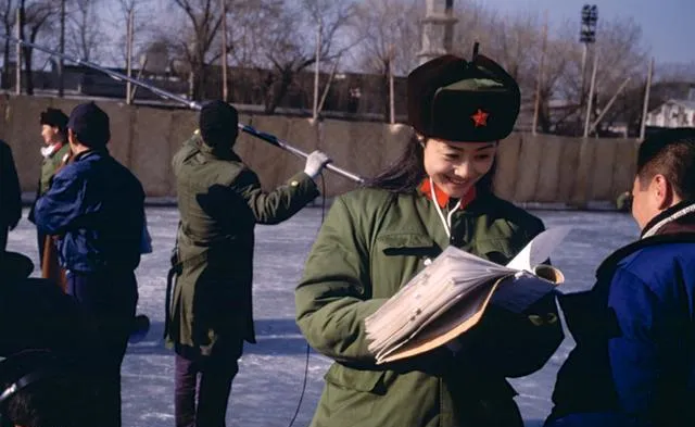 这身棉军绿是冬训时的保暖衣,帽檐上那颗红星亮得很,姑娘翻着册子笑,冰面上晒得冒白光,后头几个师傅拖着杆子收线,小时候我在工体边上围着看,脚尖冻得发麻还不愿挪窝,叔叔说小心别踩线,话音还在耳边转,冬天的阳光真硬朗。
