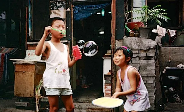 孩子吹的这个叫泡泡水,圆环一蘸一抹,泡泡鼓鼓的,映出门楼和天空,妹妹笑得眼睛弯成月牙,旁边木柜子上摆着搪瓷缸和盆,狗尾巴草从墙根儿探出来,晚饭的蒸汽往巷口飘,小时候我蹲在台阶上看过同样的泡泡,轻轻一碰就散,碎光往心里钻。