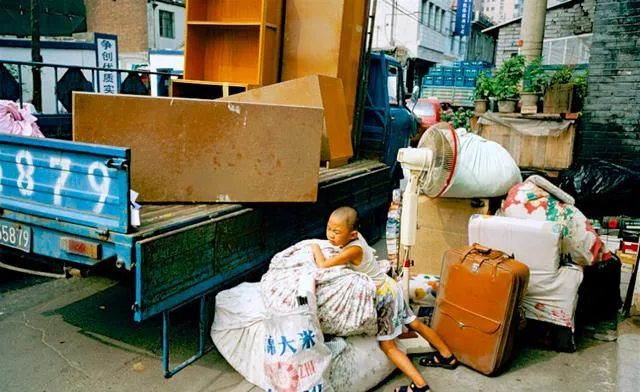 这是搬家现场,小蓝车斗里立着木柜,地上摞着大米袋和扇叶,行李箱边上趴着困得不行的小孩,爸在旁边喊快点,太阳毒得很,汗打着圈往下淌,钥匙刚拿到手就想先看阳台,邻居递来一杯温水,说慢点来,日子总要一间屋一间屋地往前搬。