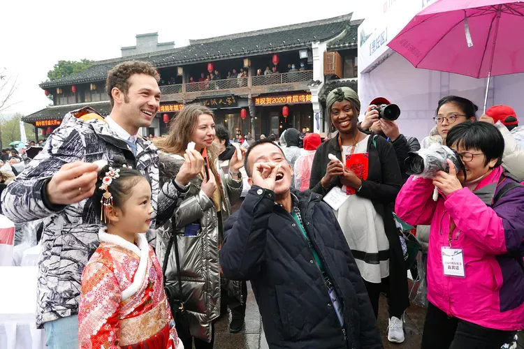 2020年外国友人在鸣鹤年糕节参与年糕制作体验及互动环节(沈斌煊摄)