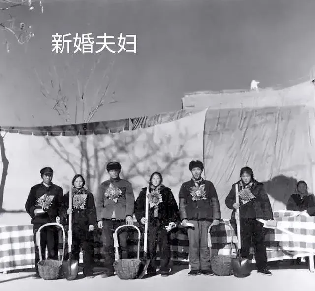新婚夫妻六人排成一队,手里拎着箩筐铁锹,没有西装婚纱,有的就是一颗心和对生活的信心,背景是老布单和院墙,阳光下全家的希望都扎在脚下的土地上,那时候结婚不过就是一块照片、一阵热闹,却能过一辈子。