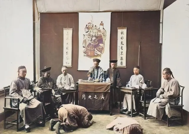 这张图里是公堂断案,正中间的官帽子端着,面前一张小方桌,案卷堆着,垂头跪着的犯人,身后是文书师爷和差役,七个人有的扇子半掩,有的神情紧绷,气氛确实沉,真要说电视剧演得浮夸,拍案怒斥那些是看不到的,更多是规矩一板一眼。爷爷以前说,能上公堂的案子都不小,大多数百姓兜兜转转碰不上一次。