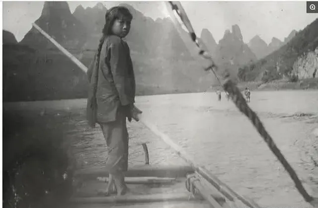 这女孩细胳膊细腿,站在竹筏头,背后全是连绵的山和水,头发盘着,随便扎起两撮,脚下踩在湿滑的竹板上,眼神干净又有点倔强。小时候在河滩下边也见过渔家姑娘,她们下水利索,会划船,会撒网,烈日晒不黑胆子倒养起来了。身上洗得发白的衣裳,是老手一看就认得的家底,没富贵气,倒有一种野生的清丽。
