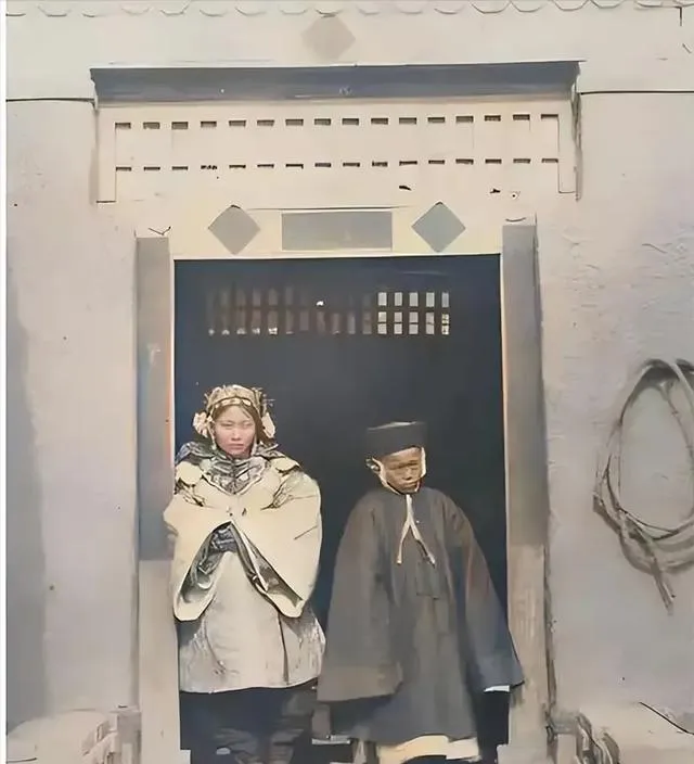 这张门口照令我想起来老家胡同口那种规规矩矩的合影,妇人披着大斗篷,头上花花簪子,背后立着个瘦老头,气氛有点紧,也可能是生活的日子太苦了,每一笔褶皱里都是算计。有人家里过节才愿意照相,现在都是随手拍个不停,那时候留下影像全是大事。