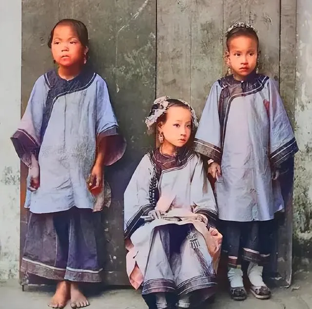 这三个小丫头,站的站,坐的坐,头发都是随便扎好,最左那个光脚,脚趾踩在泥地上,手心带着土色,衣服的料子厚又粗,上面野花乱绣。小时候村里孩子没人挑鞋穿,谁扯了块布就一脚蹬出去。有人活得硬气,也有人认命早。