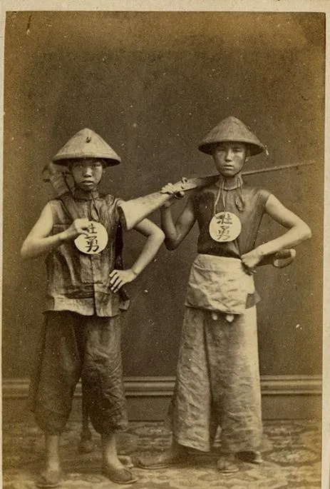 两人站着,草帽、布褂、腰间牌子挂着“勇”字,肩上扛着长枪,光膀子下面裤腿卷起,看着倒有模有样。说白了,这一身干的是力气活,也是旧社会最底层的人,真要遇上点事顶大用。小时候家里人还挂着个防身的木棒,吵闹时候拿来唬唬人。