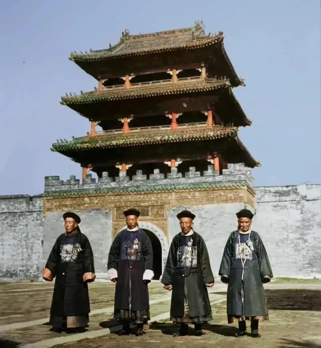 四位穿着长衫大褂的官员,站在城门楼前摆造型,衣摆拖地,腰带收紧,个个神气十足。现在偶尔还能在影楼看到穿古装拍照,但当年只有见官才敢穿这身,怕穿坏宁可拎在手里到衙门口,回家立马脱掉收好,奶奶看那些绣花就能认出哪年哪地的规矩。