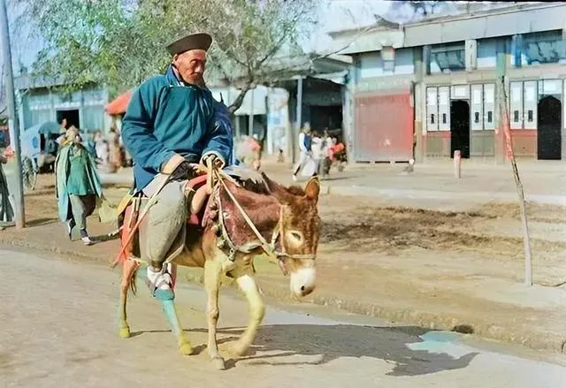 这男人骑着毛驴穿街过巷,衣服带着褶子,马鞭提在手上,驴脚上还有套色护腿。有人以为骑驴没排场,其实那时候有头驴的都是宽裕人家,没多少钱骑不起,普通百姓还得全靠两条腿。