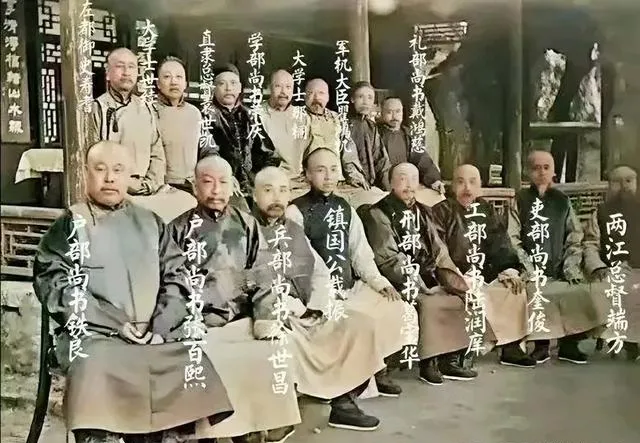 一排坐着十多个官员,身后黑漆栏杆,名字都写在旁边,文武分明。衣摆拖地,袖子宽大,能看出清末时期官场的规矩和派头。父亲每次看这类照片就念叨,穿官袍真不是平常人受得住,一场上朝折腾一天。