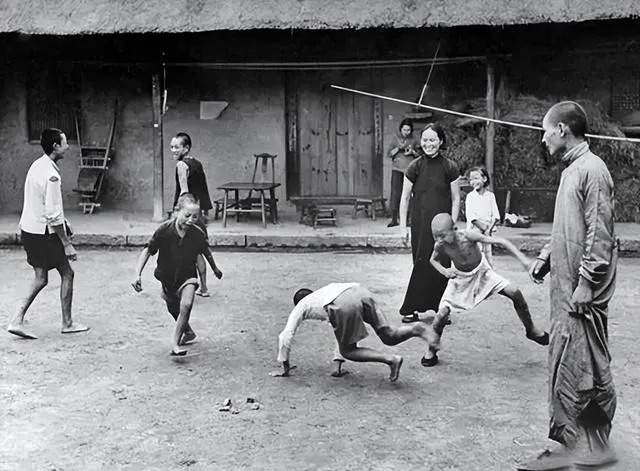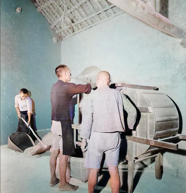 再来看看吃饭,图上几张木桌,一群赤膊小伙埋头吃得正香,桌面上大碗小碟摆满,菜是素多荤少,但谁都夹得仔细,那时候油水瘦,逮着有肉就算好日子,边吃边聊,不赶时间,偶尔谁家孩子汤撒了,搅和几句,饭桌就是一天最宽心的时候,记得我奶奶总说“以前吃饭全家热闹,饭慢慢添,碗满了大家心也踏实。”