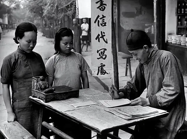 街边有个专门帮人代笔的摊子,两位穿旗袍的女人凑前,先生提笔写得龙飞凤舞,说起这档口,最早不识字的人多,想给家里远方写封信,得找写匠,写完纸一折,背后摞着旧报纸当垫板,信一封一分钱,情分值千金,现代人发微信一秒一句,感情有时还没那会儿沉实。