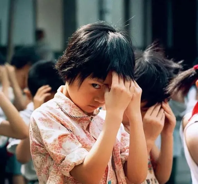 这个动作,八十年代的小孩都练过,图中女孩发梢还汗津津的,叫眼保健操,铃声一响全班人站好,两手轮流揉按,**走廊里全是“呼哧呼哧”**自言自语,老师走过来瞄两眼,“注意姿势,别偷懒”,有时候也就想着摸下胳膊碰下小伙伴浅笑一声,谁都等着下课可以更快冲出去疯玩,小时候做操时老怕被老师发现夹带私货,睁着眼装乖乖学生,总归还得盯着黑板写完课堂笔记,那个年代没几个孩子戴眼镜,大部分人眼睛都还亮光光的,蓝天底下朝气蓬勃。