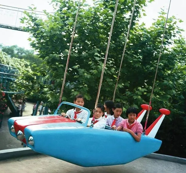 图里的蓝色小车、一排红领巾挤在一块,这叫游乐园的秋千小汽车,每年能去上一次就跟过年似的,大伙你推我搡乐在一块,轮流趴在铁皮栏杆上看别人荡,自己能抢上座那叫一个神气,晃起来风呼呼吹脸,后排胆小的尖叫前排的还回头逗笑,妈妈总在下面喊“小心点,抓紧”,可小孩哪在意,那时候骑一次能吹一星期牛,现在回头一看,倒没几个大型游乐场真的留在记忆里,倒是这些土得掉渣的摆件最让人心心念念。