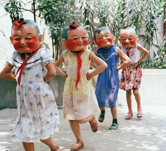 这个东西叫娃娃面具,男孩女孩都爱戴上,一戴就换个人似的,脸蛋涂得通红,黑头青鬓,笑得咧开嘴,穿着妈妈改的小花裙,有点稚气又有点忍不住要逗别人的调皮劲,这种面具小时候常常用来过六一,舞台上排队扭腰挥手,台下家长喊“小丽,看左边!”,小孩哪懂美丑,只管笑眯眯的跳来跳去,甚至舞完了还在院子门口装神弄鬼追着人跑,现在这些画风老的东西早没市场了,谁还会专门做个笨重木头面具,小时候那种图一乐的心气,现在连在娃娃脸上都看不到了。