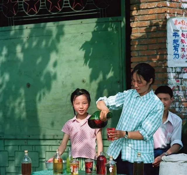 这张照片就能闻到味道,桌上砸拼瓶,妈妈用搪瓷缸给倒果子露,粉的黄的绿的全都有,夏天最盼的就是放学之后能分上一口,小朋友抢着递杯,肚子里咕咕响,冰凉一口喝下去,满嘴甜到眉梢,小时候要是谁能拿点零花钱买上一瓶,成群结队围着喝,只觉得这滋味能顶半年,怎么也喝不腻,现在饮料比河水都多,倒再没喝出那会儿的畅快。