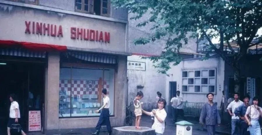 这个红色英文字母的门头就是新华书店的旧样,卷帘棚子半遮着门口,里面是木格子书架和脚踏凳,店员会拿长杆把高层书勾下来,纸张有股淡淡的油墨甜味。