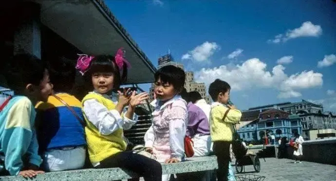 这几个小朋友身后就是外滩的水泥栏杆,背上小书包前面系着红领巾,天蓝得发亮,姐姐说那会儿周末最开心的事就是吃一根老冰棍坐在这里吹海风。