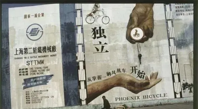 这个大手里托着钥匙的墙画是凤凰自行车广告,黑体字写着“独立从掌握一辆凤凰车开始”,爸爸笑说那会儿小伙子要是骑一辆新凤凰,走到哪都挺胸抬头。