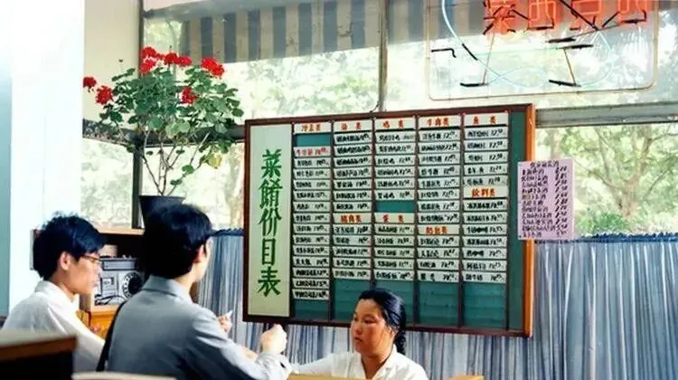 图里的木框黑板就是菜馆价目表,每道菜后面用小白牌插着价格,阿姨拿粉笔刷刷一改,今天青菜涨两分钱,师傅把勺一翻,锅边火苗舔得老高,香气蹿到窗外去。