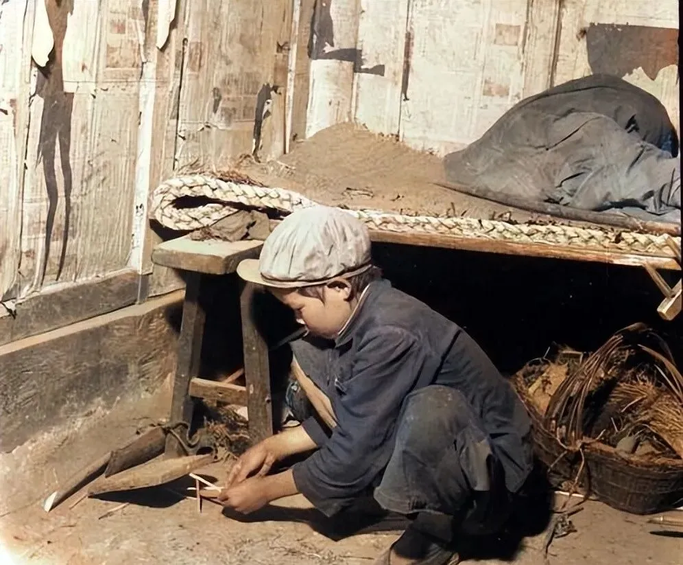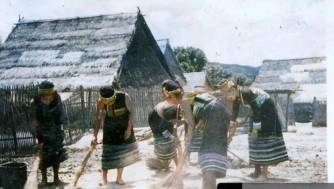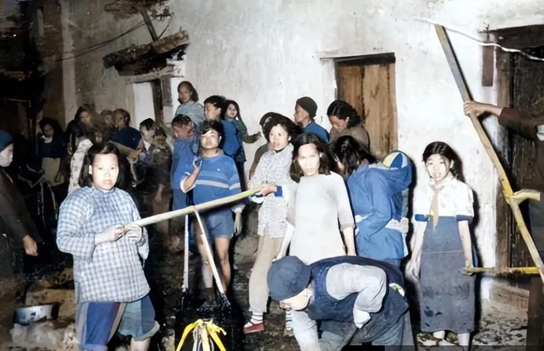 图中这阵仗叫联户清扫,竹篱笆外是泥地,屋檐下阴潮处最容易孳生蚊蝇,妇女们扎着头巾弓着腰把沟渠里的淤泥挑出来,泥水溅在裙摆上也不叫苦,奶奶说那会儿就讲究一个**“院净屋净人心净”**。