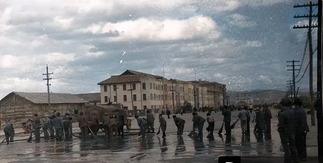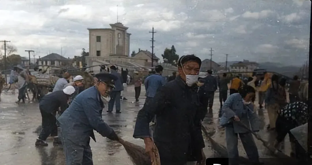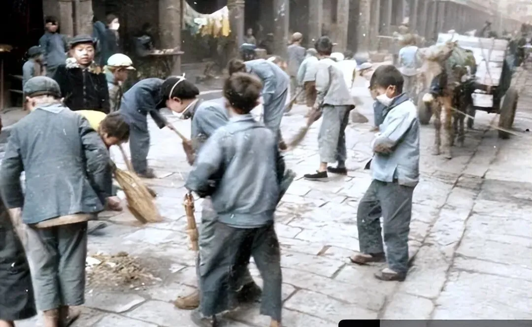 图里这把扎得粗壮的高粱扫帚叫笤帚,柄子粗糙有刺,握久了手心发麻,孩子们成排站着,一字儿刷刷往前推,尘土腾起老高,领头的大人戴着口罩吆喝一声再来一遍,那时没有洒水车,先润街再扫,水桶一担担抬,地面一会儿就见了亮。