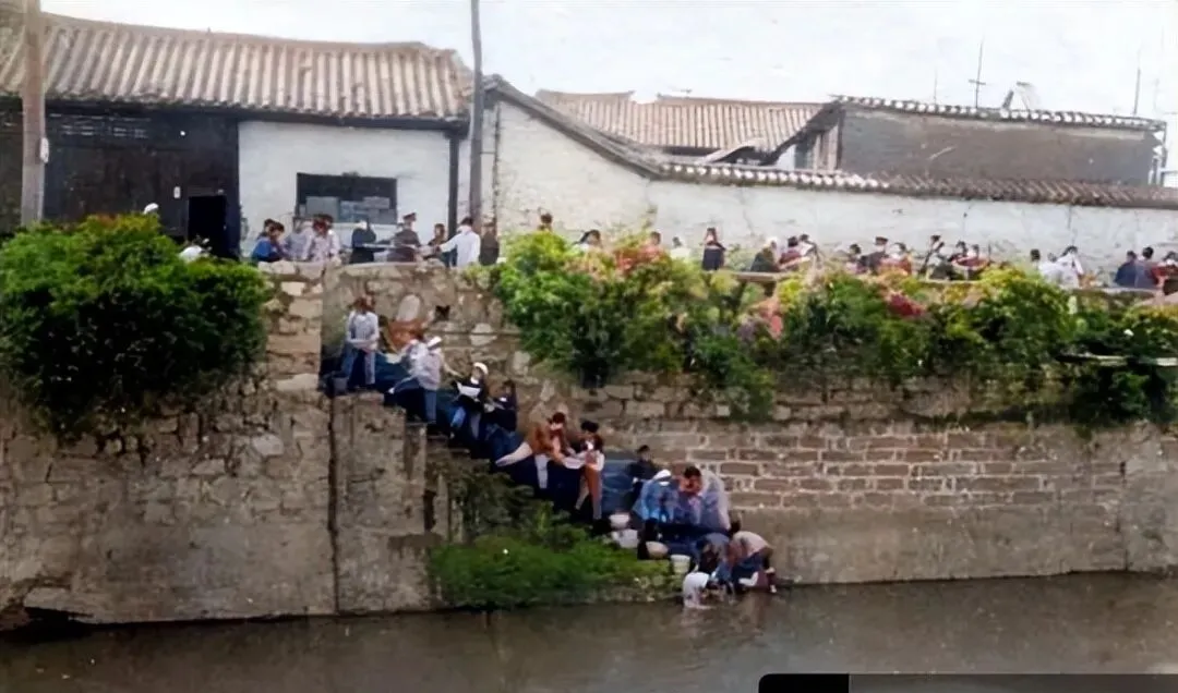 这个场景叫清沟冲洗,石阶通向河汊,木桶一只接一只往上递,年轻的把桶递得快,老的在上头稳稳接住,先把积水沟的黑泥掏走,再一桶桶冲干净,说白了就是不给蚊子留家。