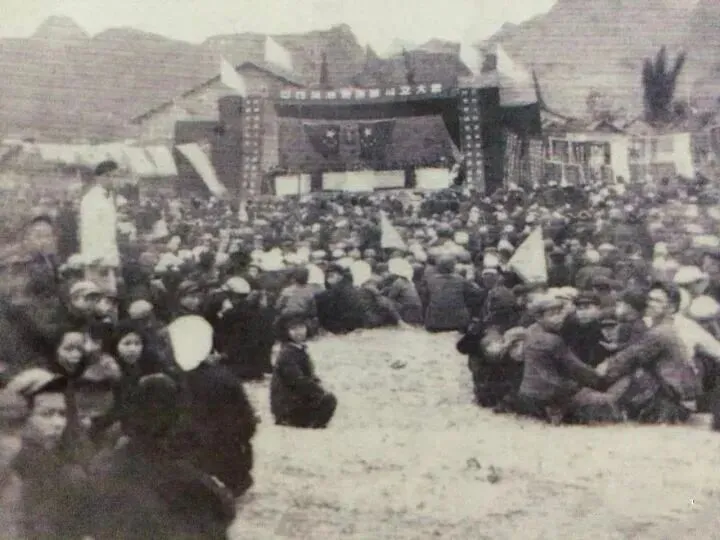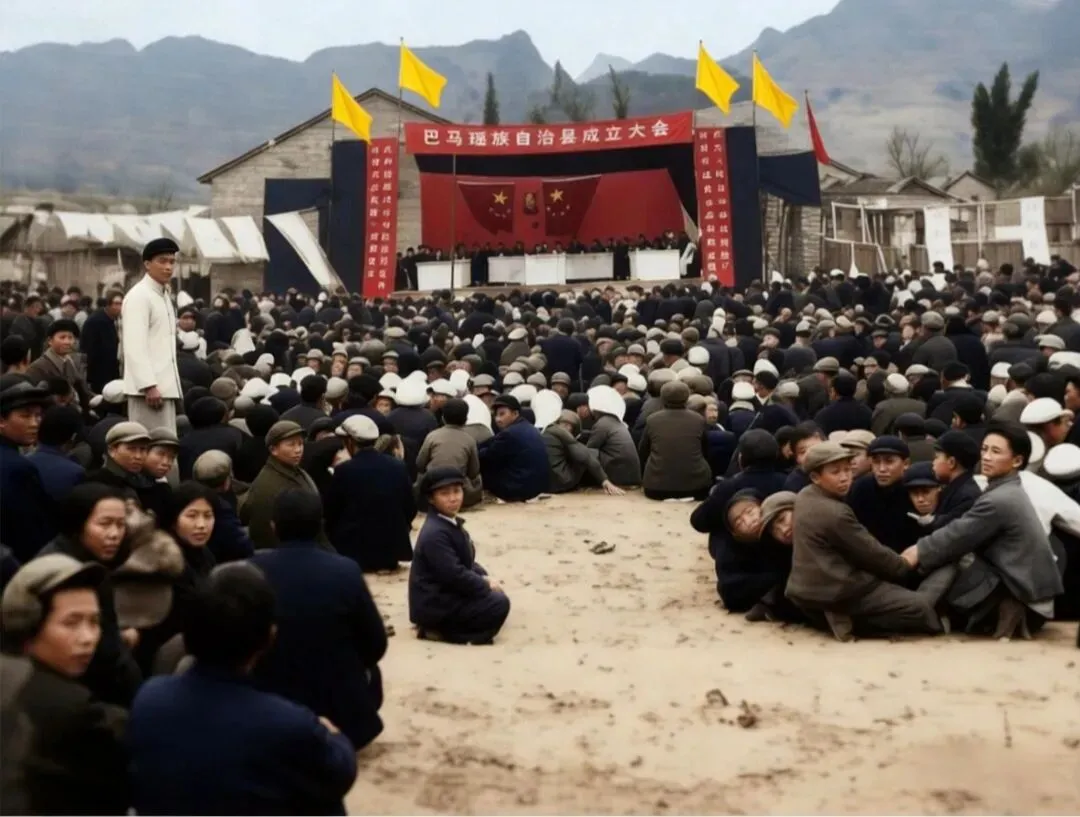 1955年9月21日,国务院批准设立巴马瑶族自治县;1956年1月27日,自治县人民委员会正式成立;同年2月1日至6日,巴马瑶族自治县第一届人民代表大会在县城召开,2月6日正式宣告自治县成立,这张照片记录的正是这一历史性时刻。