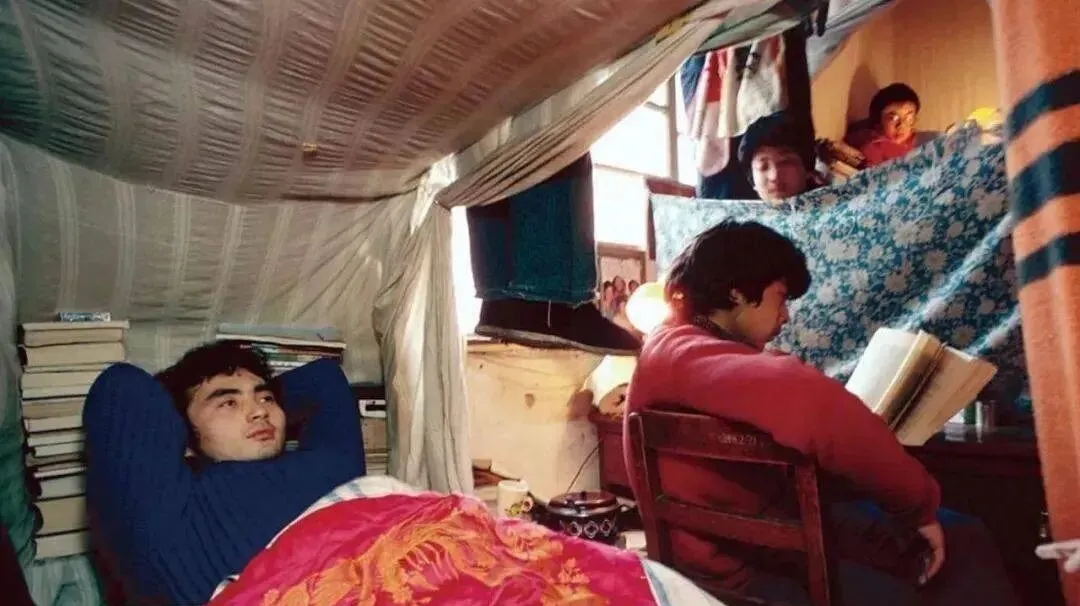 这个拥挤的小天地叫学生宿舍,被子上是大红缎面龙纹,床板下塞书,书桌上一盏圆头台灯冒着暖黄,窗帘用花布一拉就成隔断,伙伴复习累了仰头一躺,另一个还在抄笔记,妈妈看照片笑我说,你们那会儿连衣柜都省了,行李箱就是柜子,现在的孩子们住的是公寓,我们当年靠卷子和馒头把日子撑过去。