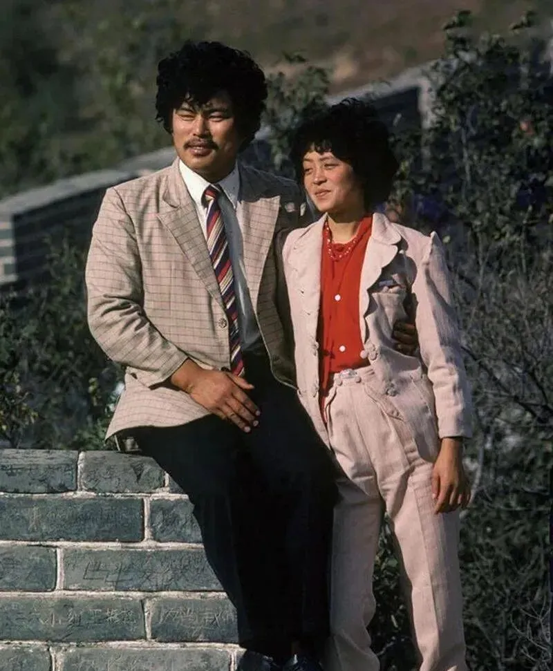 这对穿着讲究的小两口在拍结婚照,男的格子西装配条纹领带,女的粉色套装腰线利落,站在垛口那儿让风一吹,刘海就服帖了,摄影师喊一二三别眨眼,咔嚓一下就是一生的底片,那会儿底片节省是铁律,现在手机咔咔连拍,挑花了眼也未必更珍惜。