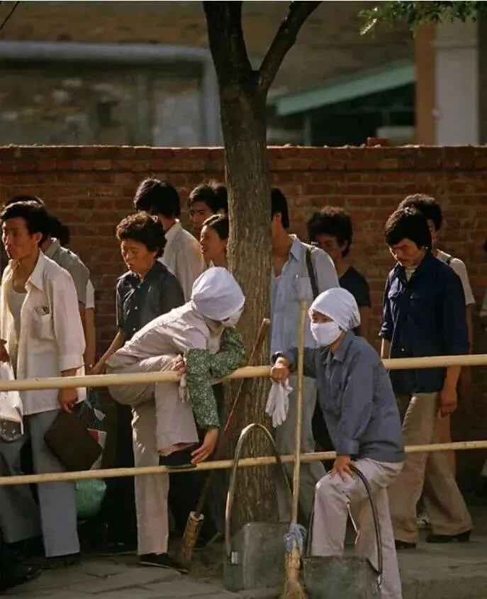 这身蓝灰工作服搭的叫防尘口罩,白布缠好只露出眼睛,脚边一支竹把笤帚绑着麻绳,靠在树下喘口气又上路,当年空气不比现在清亮,奶奶常说,扫一街尘土一身,回家得先拍两下再进门,现在机器上了街,但手工的细致劲儿总归踏实。