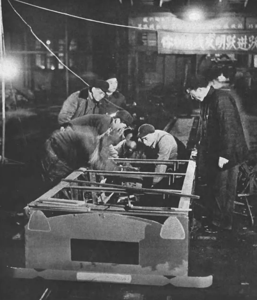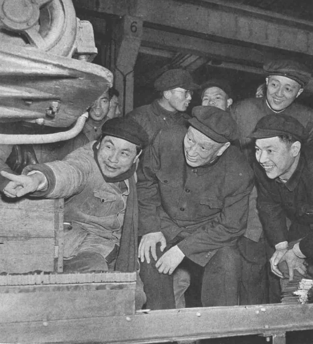 五〇三工地上的科室人员也参加到生产中来。这是工人们为挖土机的试制成功前来向他们报喜