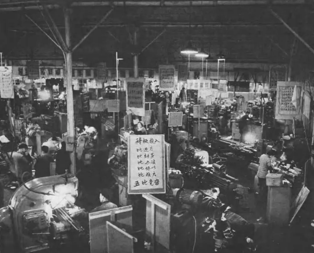 上海机床厂车间灯火辉煌,大搞生产的夜班工人