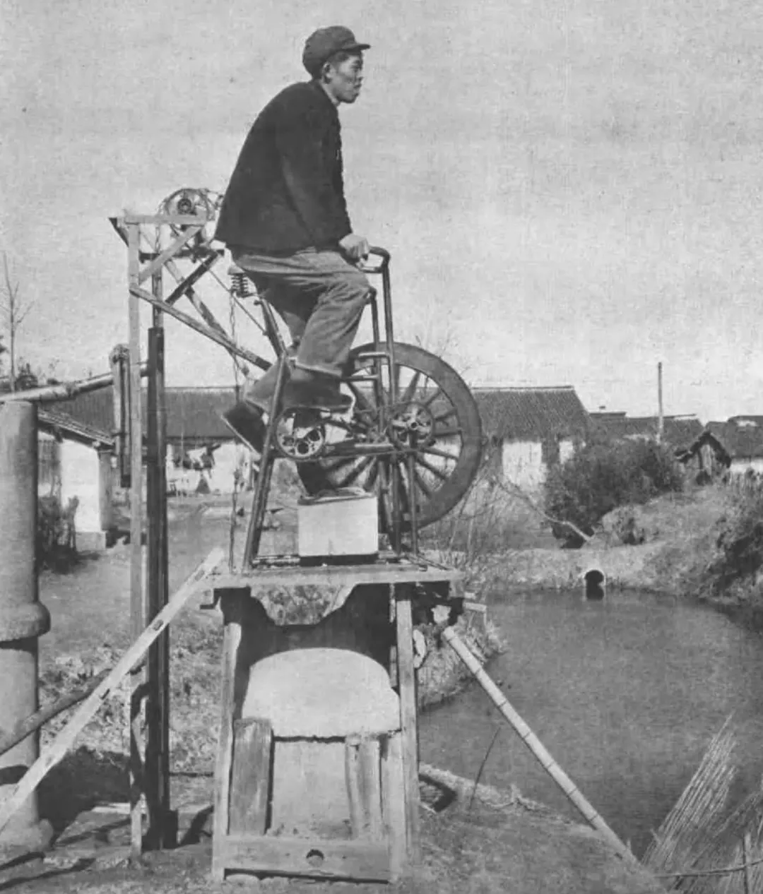 南陈巷生产小队创造的脚踏抽水机,可以把河水直接送到饲料间和猪舍里