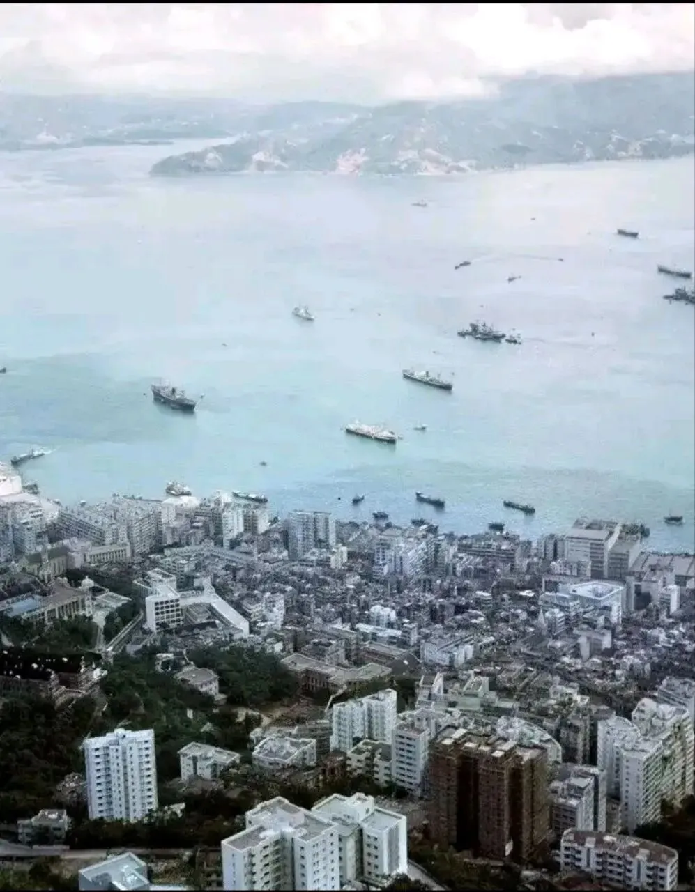 这是一张从香港太平山顶俯瞰维多利亚港的彩色老照片,拍摄于1965年。