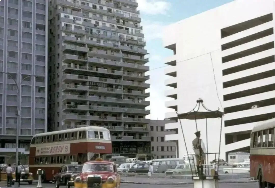 这张照片生动地记录了20世纪60年代香港作为亚洲新兴金融中心的城市面貌,当时的香港正处于经济起飞阶段,现代化的摩天大楼与传统的城市景观并存,展现出独特的时代张力。