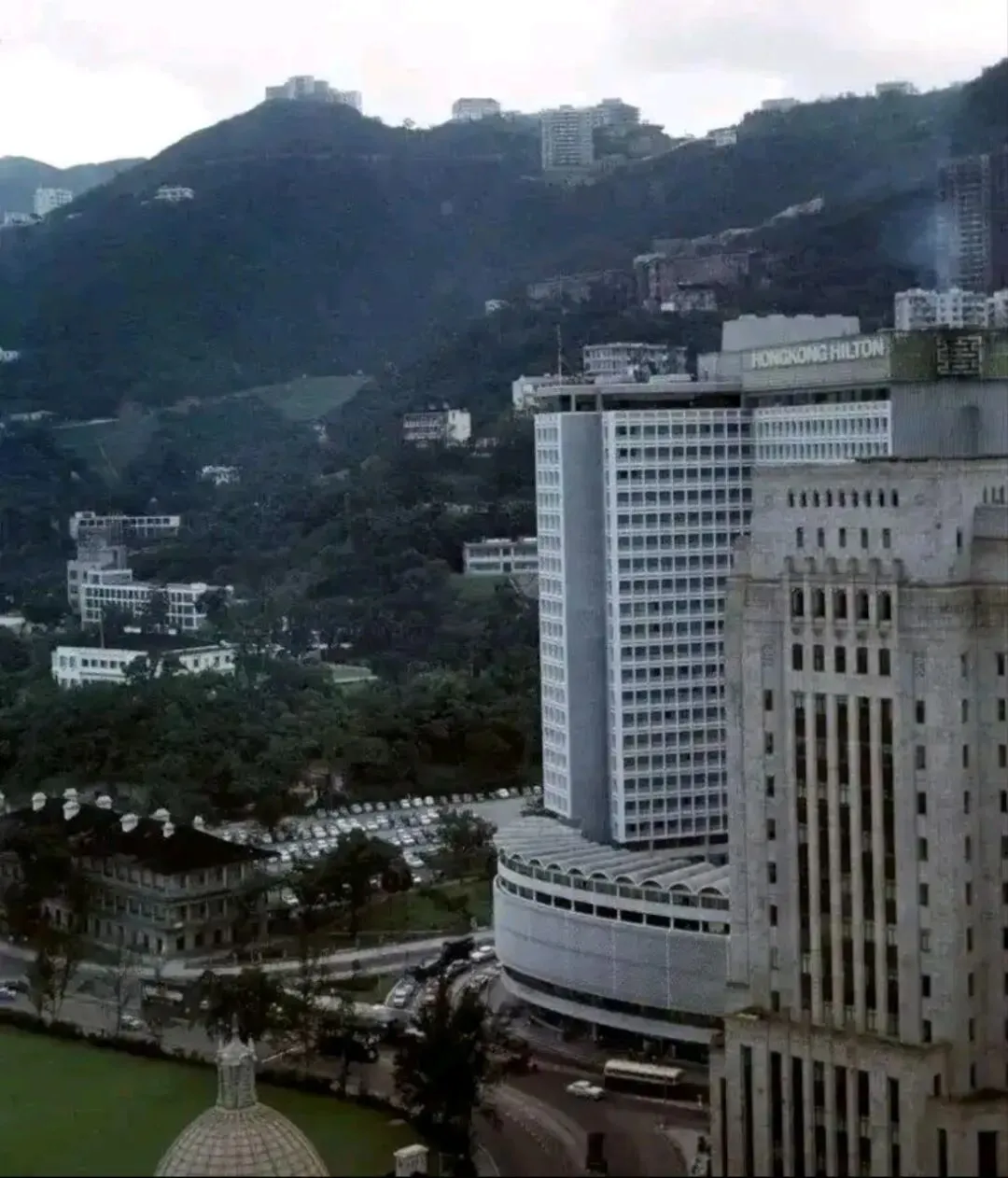 画面中最醒目的建筑是香港希尔顿酒店,它于1963年开业,是当时香港最豪华的酒店之一,旁边的古典风格建筑是旧中国银行大厦,下方的绿色草坪是遮打花园,背景则是香港岛的太平山。