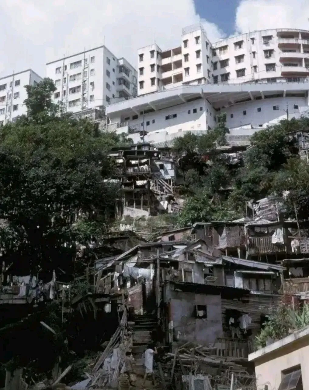 1965年的香港正处于经济起飞阶段,人口激增导致住房严重短缺,大量从内地来港的底层民众只能在山坡上搭建寮屋,而政府则在附近兴建公共屋邨来安置居民,这张照片正是当时香港贫富同框,新旧交织的城市面貌的生动写照。