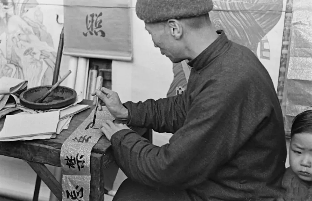 那时候,印刷技术还没普及,春联大多是手写的。照片里的男子写的字可以看出来一点不孬,凭借这手艺,街头艺人大多能在春节期间挣上一笔。