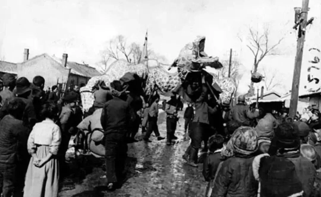 照片里,村民围着看舞龙表演。那时候人们的娱乐非常少,舞龙算是很大的表演了,所以一般只要没啥重要的事都不会错过。