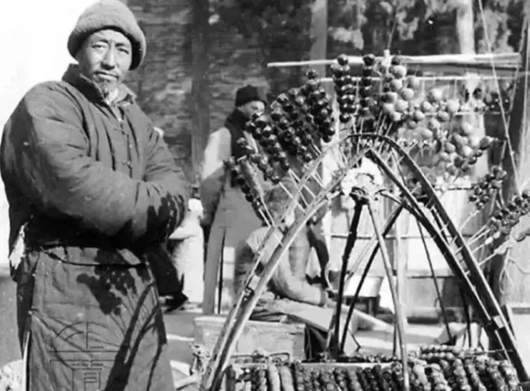 这阵势要比现在不少小摊还大,在当时的北京街头,糖葫芦是标志性小吃,有的摊主是固定位置出摊,有的则会大街小巷叫卖。