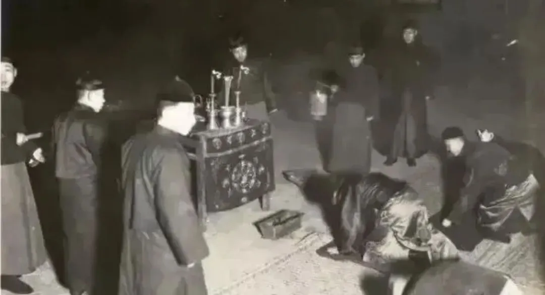 应该是一个家族,大家在挨个进行三叩九拜。旁边还有人提着灯笼,说明是在夜里,一般是在除夕或者初五凌晨。