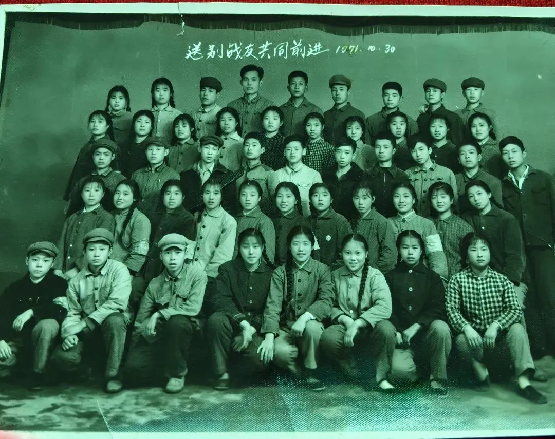 今天,我也翻出一张年代感十足的老照片,五十多年过去了,我的那些同学你们好吗?记得,这张照片是欢送一个叫张敏的女同学,她学习好,表达好,各种会议都爱发言,人又随和。她爸爸是军官,调动工作了,她也转学了,所以照片上面有“欢送战友”字样。当时,班级女生多,男生少,老师就让我和另一个高个女同学去补齐最后一排男同学,我心里很不乐意,有种被女生遗弃的感觉。后排最高个子的那个是老师贺元福,想想贺老师多好哇,堂堂老师不坐前排,不坐正中,而是站在最后排夹在学生中间。